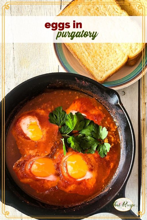 Eggs in Purgatory is a simple meal of eggs poached in a spicy tomato sauce. Perfect for breakfast, brunch or a meatless supper.