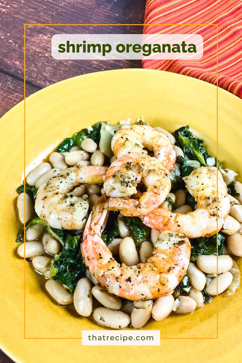 Shrimp Oreganata combines shrimp, garlic, oregano and lemon juice (or lime juice in this case). This recipe serves it with a simple combination of cannellini beans and escarole for a delightful one pan meal.