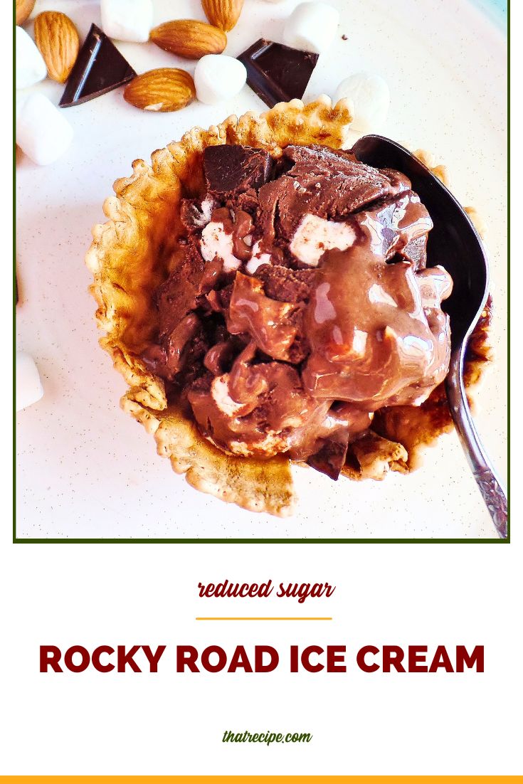 rocky road ice cream in a waffle cup with text overlay "reduced sugar rocky road ice cream"