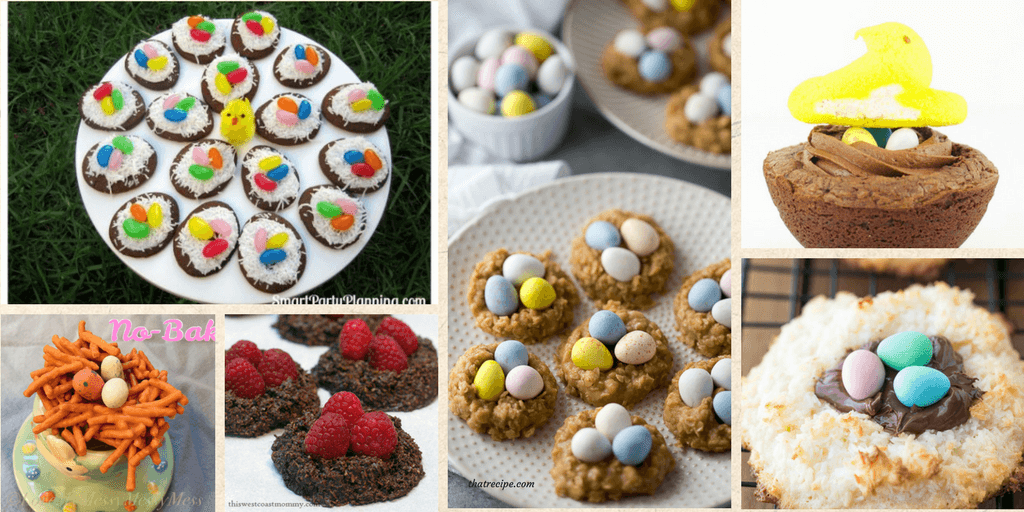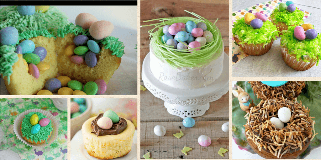 There are almost as many ways to get creative with the nest material as bird's use in real life. Bird's may use leaves, twigs, bark, grass, etc. But for an edible version you can use cake, cookies, brownies, chow mein noodles, cereal or coconut to name a few. Top them with jelly beans, candy eggs or some fresh berries for the eggs and you have a delicious and adorable treat.