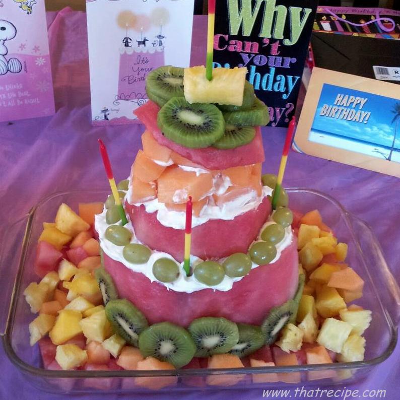 Not five miutes after I posted some fruit themed cover photos to Facebook, Google+ and Twitter than one of my friends posted this picture of the Birthday Fruit Cake that her daughter made her for her birthday.