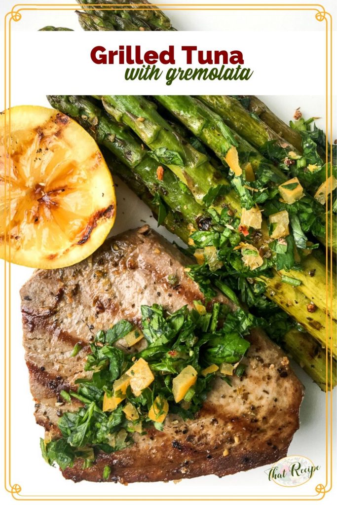- Remove tuna and grilled lemon halves from heat and serve immediately topped with some gremolata.